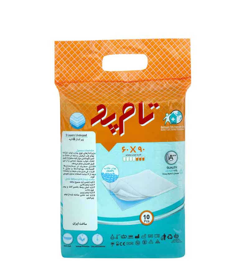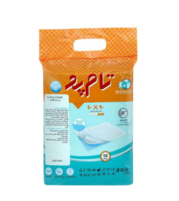 زیرانداز ۵ لایه تام پد سایز ۶۰ در ۹۰ سانتی‌متر، بسته ۱۰ عددی، یکی از محصولات پرطرفدار در دسته‌بندی لوازم بهداشتی و پزشکی است که برای استفاده در بیمارستان‌ها، مراکز درمانی، نگهداری از سالمندان، نوزادان، حیوانات خانگی و حتی در سفر مناسب می‌باشد.
