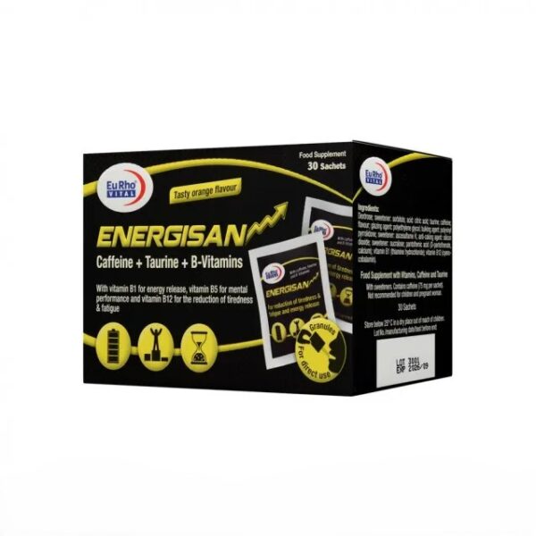 ساشه خوراکی انرژی سان یوروویتال حاوی کافئین ۷۵ میلیگرم، تائورین ۱۰۰ میلیگرم و ویتامینهای B1، B5 و B12 است.