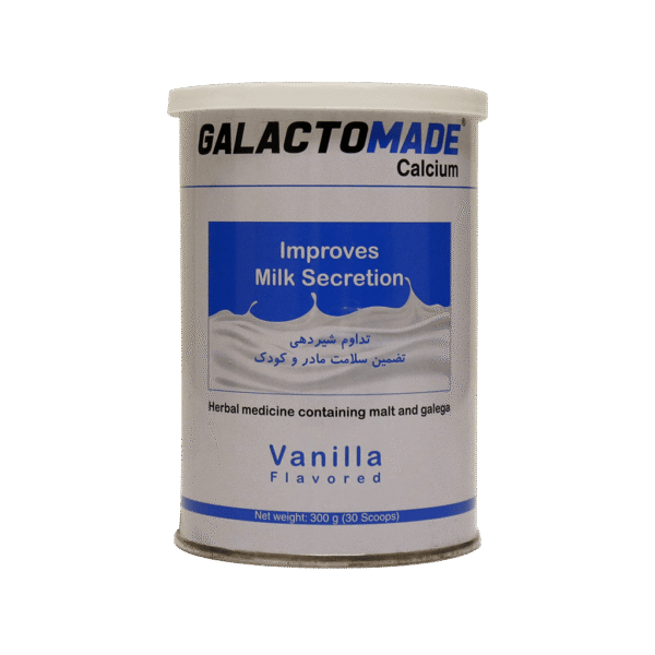 • نام کامل: پودر شیر‌افزای گالاکتومید کلسیم (Galactomade Calcium Powder)، طعم وانیل، وزن ۳۰۰ گرم